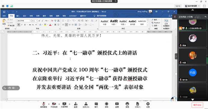 在班会上,各班团支书带领大家一起学习《习近平在庆祝中国共产党成立100周年大会上的讲话》和《习近平在庆祝中国共产党成立100周年“七一勋章”颁授仪式上发表重要讲话》文件,深刻体会到我国实现第一个百年奋斗目标的艰辛,在过去的一百年里经过全党全国各族人民持续奋斗,在中华大地上全面建成小康社会,历史性地解决了绝对贫困问题,这是中华民族、中国人民、中国共产党的伟大光荣,我们之所以能取得这一伟大成就离不开革命前辈们的不断探寻,也离不开后辈们的不断奋斗。