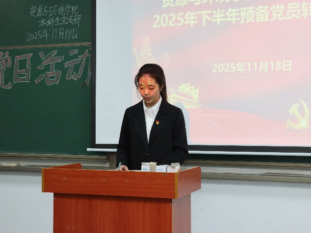 (通讯员孙文静) 2025年11月18日下午6点, 公司本科生党支部于武教A106举行2025年下半年预备党员接收暨转正大会,学工办主任李春花老师、员工党员、发展对象参会。 大会第一项,接收预备党员。3名发展对象依次上台向党组织汇报入党动机、成长收获、未来发展及需要向党组织说明的问题。发展对象入党介绍人对发展对象的情况加以说明,并对其能否入党表明意见。经支部讨论和无记名投票表决,同意接收李燕丽等3名发展对象为中共预备党员。 大会第二项,预备党员转正。申请转正的4位预备党员依次上台,向党组织汇报了预备考察期学习、工作、针对自身不足改进情况,深刻阐述了对党的认识、入党动机以及个人成长与进步。经支部大会讨论和无记名投票表决,同意答淑涵等4名同志按期转为中共正式党员。 此次支部大会的召开,为党组织注入了新鲜血液,壮大了党员队伍。李春花老师在总结讲话中强调,全体党员要时刻牢记入党初心与动机,将不足与批评化为动力,不断加强理论学习,在学习、工作和生活中发挥党员的先锋模范作用,为公司的发展和党的事业贡献自己的力量。 审核(李春花)