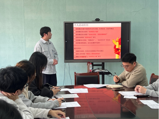 随后,发展对象杨洪同志以PPT汇报的形式进行了答辩陈述。汇报围绕个人基本情况、入党动机、理论学习情况、科研学习与社会实践经历以及未来努力方向等方面展开。杨洪同志结合自身成长经历与学习实践,分享了自己对党的认识与理解,表达了积极向党组织靠拢、在学习科研和社会服务中发挥先锋模范作用的坚定决心。