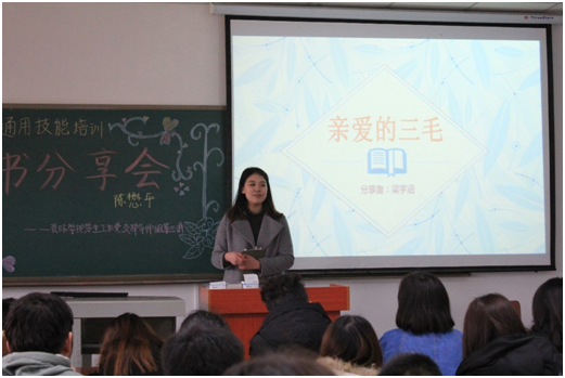 (通讯员 梁赟/文 秦煜萱/摄)众所周知,书是人类进步的阶梯,2017年3月25日下午四点,刘娥老师带领永乐高员工工作党支部在武培B209举行了主题为读书分享会的导师组学习第三讲讲座。为了让大家更贴近书籍,领略文字的美丽,由党支部成员芦鹏飞担任主持人,在导师组成员吴文峰,郝鸿博以及梁宇涵分别精心准备下,给大家带来了震撼的听觉享受。