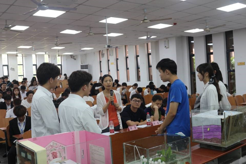 活动伊始,由两位主持人分别介绍了到场的评委及嘉宾,并简要介绍了活动规则,同学们观看了六支参赛队伍的介绍视频。在比赛正式开始后,每组主讲人上台进行答辩,答辩时间为六分钟,答辩结束后,由评委老师对各组成员进行提问和点评。在三组答辩后,进入了热闹的互动环节,每位观众都踊跃参加,答对的观众获得了精美的小礼品。在互动环节后,剩余的三组选手继续进行答辩,面对老师的提问,选手们积极回答并认真讲解模型。
