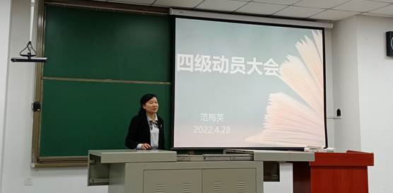 大会最后一项,党委副书记范梅英老师宣读公司四级专项奖励办法,同时从考研、就业、个人成长发展等多个方面阐述四级的重要性与必要性,并对同学们的英语学习提出了几点建议,她鼓励同学们树立坚定必胜的信心,要进行科学规划,及时总结,做到有计划、有方法、有步骤的学习,以饱满的精神状态全身心投入到四级备考中。