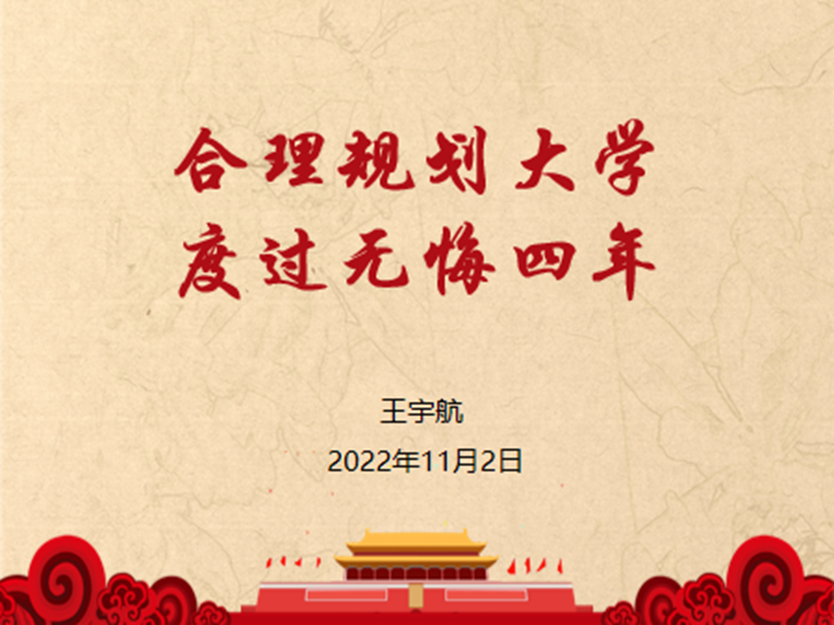 (通讯员 陈锦/图 陈锦 邱语嫣/文)怎么合理安排老员工活,如何坚持住最初的梦想?为营造积极健康的学习生活环境,帮助大一新生更快适应老员工活的角色转换,十一月二日晚七点,永乐高本科生党支部副书记王宇航同学,以腾讯会议的形式开展了以“合理规划大学,度过无悔四年”为主题的导师组讲座。本次讲座由员工辅导员黄鹏老师主持,全体22级同学参加。