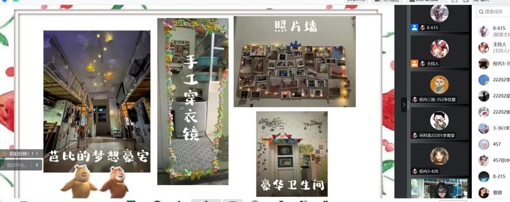 决赛期间,为做好疫情防控工作,在宿建部成员的妥善安排下,活动在线上正常举行。在主持人声情并茂的开场白之后,活动正式开始,各参赛选手根据本寝室制作的PPT将寝室中丰富多彩的日常生活及独一无二的宿舍装饰呈现在大家面前。中场游戏疯狂猜emoji则让活动进入了一个小高潮,大家争先恐后,好不热闹。游戏过后剩余参赛选手仍饱含激情的将本寝室介绍完毕。最后,由范梅英老师对本次活动进行总结发言,肯定了员工会成员对此次活动的付出,表达了对参赛寝室独树一帜的创意及温馨有爱宿舍氛围的赞美,同时寄予同学们劳逸结合的期望,并鼓励同学们积极参与公司举办的活动,展示老员工活力四射的校园生活并对资环学子寄予殷切的期望。