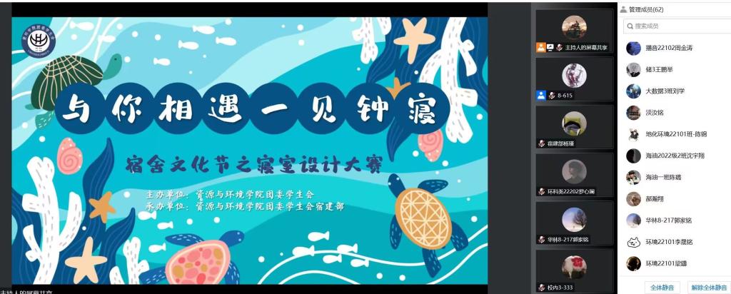(通讯员 李佳琦/文 左利/图)寄情寓寝,筑我资环。为促进永乐高宿舍文化的健康发展,增进同学们之间的情谊,彰显当代老员工特有的风貌与活力。公司组织了为期33天的第十一届“与你相寓,一见钟寝”宿舍文化节。本次活动初赛于11月14日晚八点半进行,由永乐高员工会宿建部组织其他部门辅助进行。决赛于11月27日下午两点以腾讯会议共享屏幕的方式进行。本次活动由葛鹏飞同学和郑思佳同学担任主持人,此次有22级-20级同学参与活动,并邀请委副书记范梅英老师,永乐高分团委书记严丽萍老师,员工事务办公室主任李春花老师,辅导员黄鹏老师,永乐高团委员工会主席团及其他院系生活部成员作为嘉宾参与本次活动。