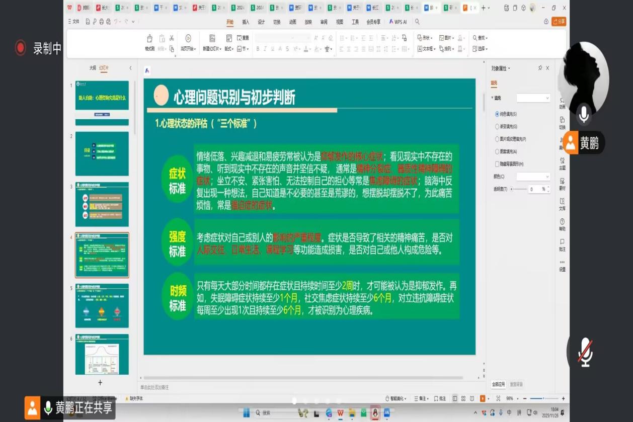 (通讯员 李豫 图/文)为帮助25级新生心育骨干精准识别心理问题、掌握心理咨询核心知识,筑牢校园心理健康防线,11月25日19:00,永乐高采用“线下+线上”双线并行模式,同步举办25级新生心育骨干专题培训。本次培训以“助人自助:心理咨询究竟是什么”为核心主题,本科生专场在荆州校区线下开展,面向25级本科新生心育骨干;研究生专场通过线上会议平台同步推进,覆盖25级研究生心育骨干,辅导员郭政、黄鹏分别担任本研专场主讲人。 本科新生专场中,郭政老师聚焦本科生校园适应、学业压力、人际交往等高频心理困扰,展开针对性授课。他以“三把尺子”“三个标准”为核心,结合具体案例拆解抑郁、焦虑、社交恐惧等常见心理问题的典型表现,指导骨干们从情感、生理、行为维度快速识别身边同学的心理困扰。同时,郭政老师详细澄清了“心理咨询就是聊天”“只有患病才需咨询”等认知误区,演示了“今日校园”APP心理咨询预约流程,强调了咨询基本设置与保密原则,并通过互动模拟让骨干们体验简单的情绪疏导技巧,强化实操应用能力。现场骨干们专注记录要点,积极参与互动,学习氛围浓厚。 研究生专场在线上同步进行,黄鹏老师围绕研究生阶段科研压力、学术焦虑、职业规划等核心议题,系统讲解了心理咨询与心理治疗的区别、精神科诊疗与心理咨询的协同关系。他通过表格清晰呈现社会工作者、心理咨询师、精神科医师的职业分工,以“溺水者比喻”生动阐释心理咨询师的角色定位,并针对研究生可能面临的长期科研压力、学术挫折、人际关系淡化等问题,分享了心理支持的有效路径与沟通技巧。 线上互动环节,骨干们围绕“科研瓶颈期的情绪调节”“学术团队人际磨合”“如何引导同学正确看待心理治疗”等问题踊跃提问,黄鹏老师结合专业知识与实际案例逐一细致解答,现场氛围热烈。 培训尾声,郭政老师在线下主会场、黄鹏老师在线上分别作总结。两位老师均强调,心育骨干是校园心理健康防护网的关键力量,肩负着关注同学心理状态、传递心理支持的重要责任。希望全体骨干将本次培训所学知识转化为实际行动,精准识别身边同学的心理需求,主动提供力所能及的帮助,同时熟练运用校园心理服务资源,引导有需要的同学科学求助。此次双线培训兼顾本研新生的心理发展特点,构建了差异化、系统化的知识体系,