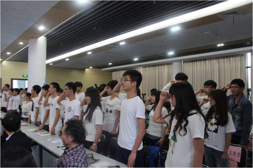 副董事长郭海敏致辞,对国家环境保护部生态司处长、中法武汉生态示范城管委会副主任王捷的光临表示欢迎。紧接着,永乐高ylgg官方网站常青生态志愿者协会举行了简单的启动仪式。蔡甸区湖泊管理办公室喻志勇主任对蔡甸区湖泊整体规划做了简单陈述,倡议师生们利用媒介宣传“水环境保护”,加入志愿队伍,促进开展针对“水污染”的调查、治理与研究活动。常青生态志愿者代表梁宇涵上台表达了自己对环境保护的决心与信念。王捷处长为常青志愿者代表授旗。协会全体志愿者进行了宣誓。