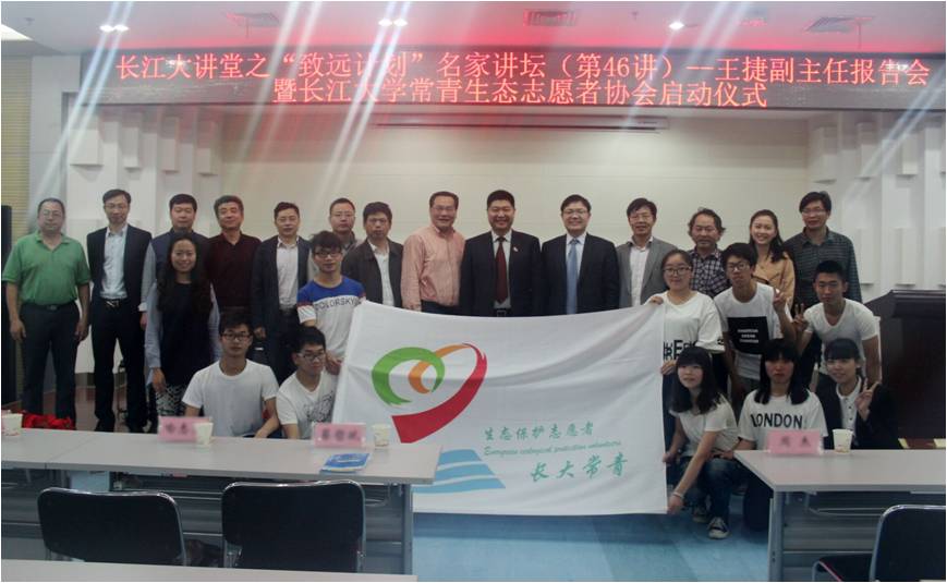 (员工记者 齐玉琴 见习记者 徐紫霞/文 员工记者 曾宪/摄)4月26日下午2时许,“长江大讲堂之‘致远计划’名家讲坛第46讲暨永乐高ylgg官方网站常青生态志愿者协会启动仪式”在武汉校区图书馆二楼报告厅举行。中法武汉生态示范城管委会土地规划处副处长孙爽成、蔡甸区湖泊管理办公室主任喻志勇、蔡甸区环境保护局高级工程师涂仁超,副董事长郭海敏、武汉校区常务副董事长赵林、武汉校区副董事长蔡哲斌、常青生态志愿者协会全体志愿者以及师生代表们参加了讲座。