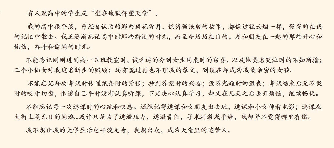 高中时在妈妈的管教下回归学业,跟其他同学一样参加数理化的补习班,我吃不了专业运动员的苦,受不了他们的伤,忍不了他们的痛,所以和大多数人一样参加高考,最终尘埃落定,坐标指向了武汉永乐高。